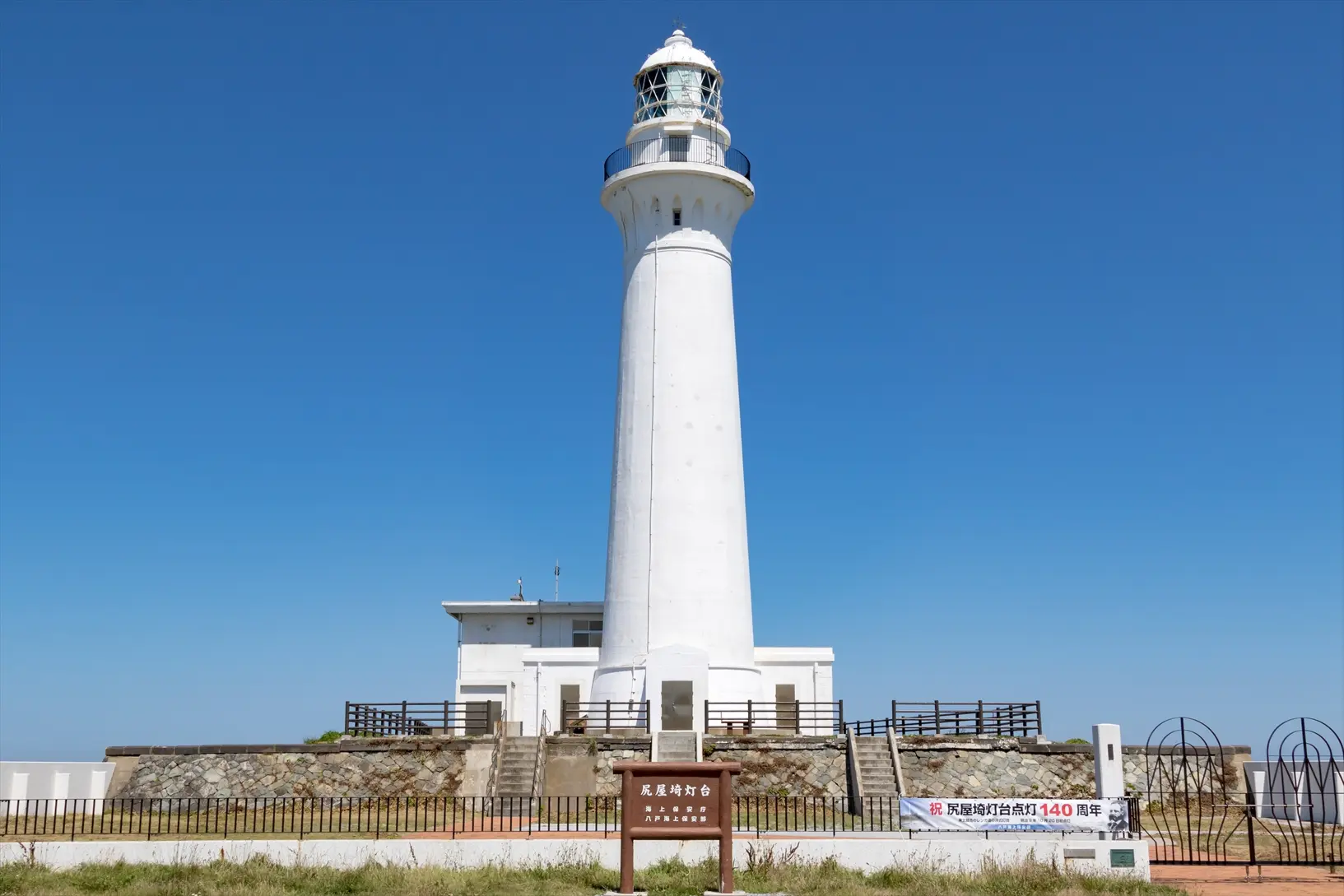 ⻘森県下北半島の、太平洋と日本海の交わる海に面する灯台。レンガ造りの灯台としては日本一の高さを誇り、「日本の灯台の父」リチャード・ヘンリー・ブラントンが建設に携わったものの一つに数えられる。また、霧信号を日本で初めて導入した灯台でもある。初めは霧鐘(むしょう)を使用していたが鐘の振動で壁に⻲裂が走ったことから霧笛(むてき)に切り替わった。戊辰戦争に敗れ、移封された会津藩士たちがレンガを焼き、実際の建築にも参加している。