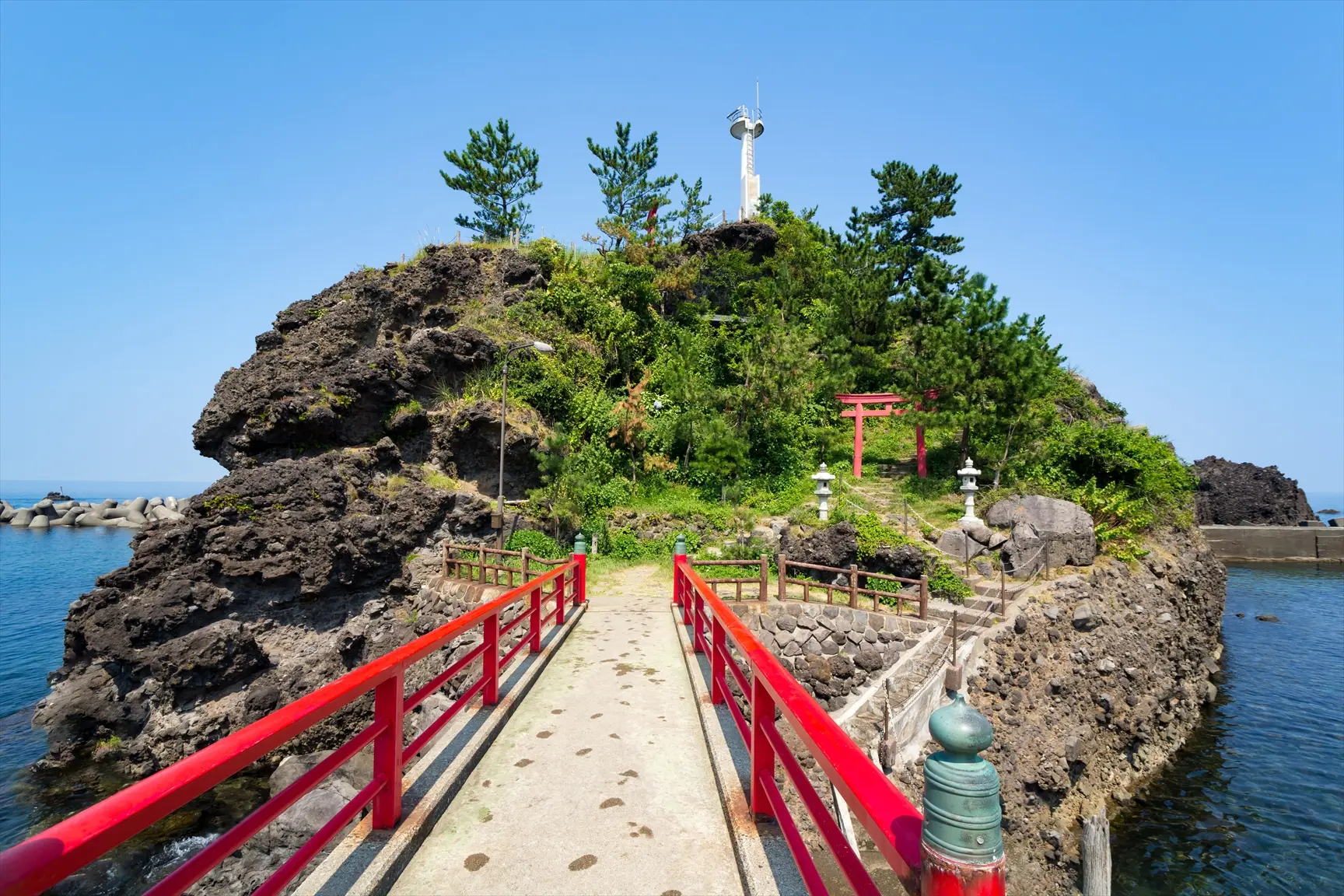 能生港の中央に位置する小さな岩島の上に立つ灯台。陸から赤い橋が架けられている。航路標識としての役目を終えた後も町民の要望で撤去されず、観光資源として再活用されている貴重な事例。岩島は弁天岩と呼ばれており、海底火山の噴火によって形成されたもの。糸魚川ジオパークのジオサイトの一つである。また、灯台の近くには小さな厳島神社がある。能生港は江戸時代から続く廻船の寄港地として有名であり、当時の風景を収めた船絵馬も残っている。