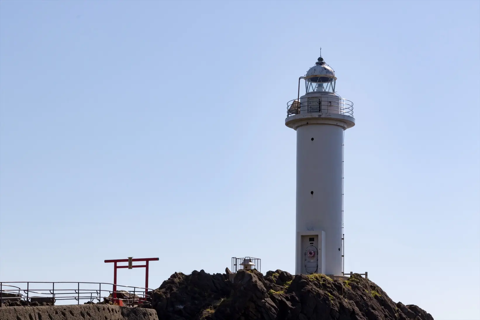 2つの鳥居を越えた先の弁天島という小さな離島の上に建つコンクリート造の灯台。1つ目の鳥居は厳島神社、灯台の足元の赤い鳥居は金毘羅神社、と2つの神社が設置され、鼠ヶ関の漁⺠の安全を見守っている。弁天島には源義経が頼朝の追討を逃れ、平泉へと渡る途中で上陸したという伝説が伝わる。「神輿流し」という厳島神社の例祭で行われる豊穣と豊漁を祈る行事が有名。
