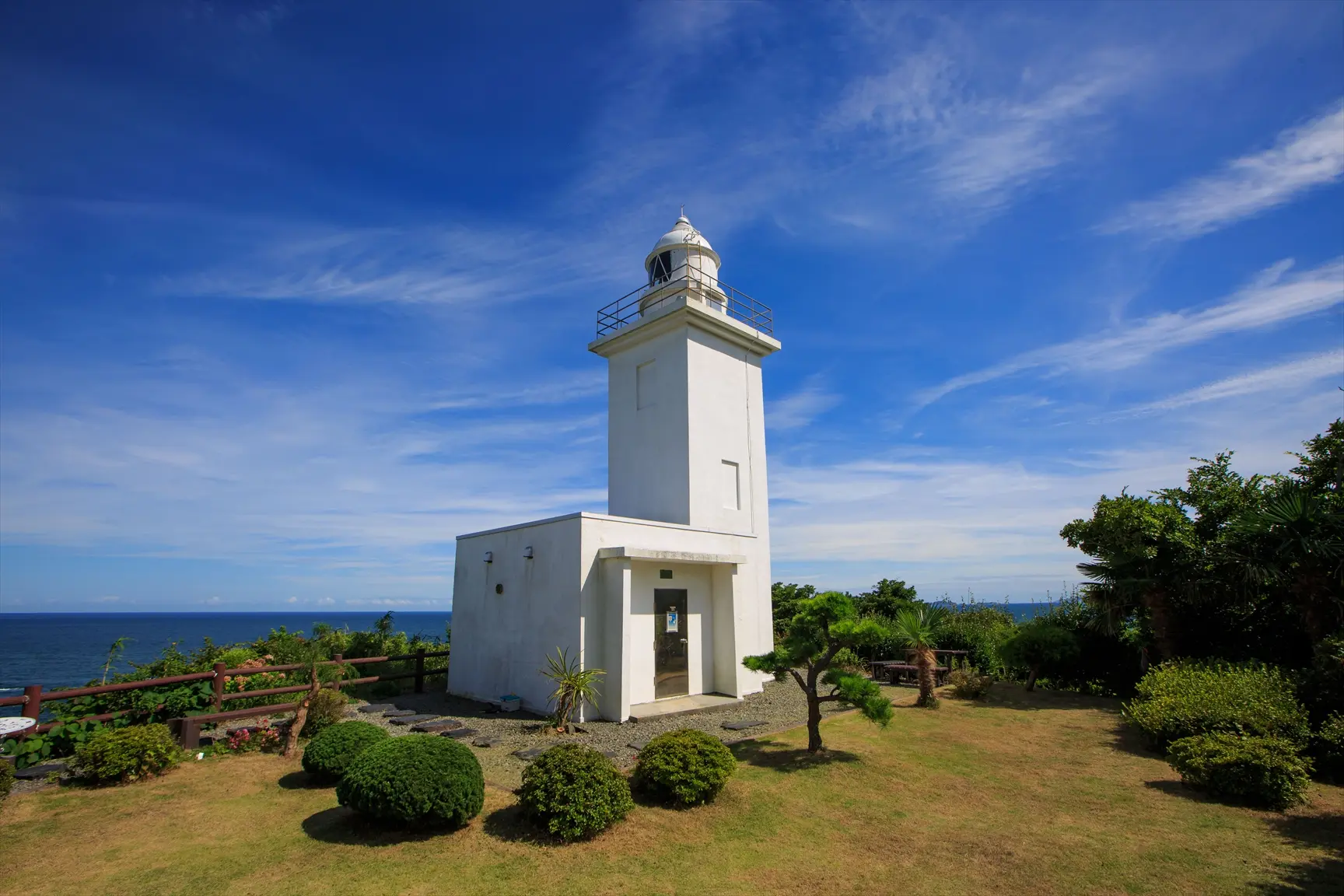 雄勝半島の東端に建つ白塔形の灯台。昭和24年に灯柱として初点灯をはたし、翌々年の昭和26年に海上保安庁によって現在の姿に建て替えられる。大須漁港に出入りする船や、雄勝半島の沖を行き交う船の安全のために夜の海を照らしている。灯台から望む大須漁港は、ハート型に見えることでも有名。