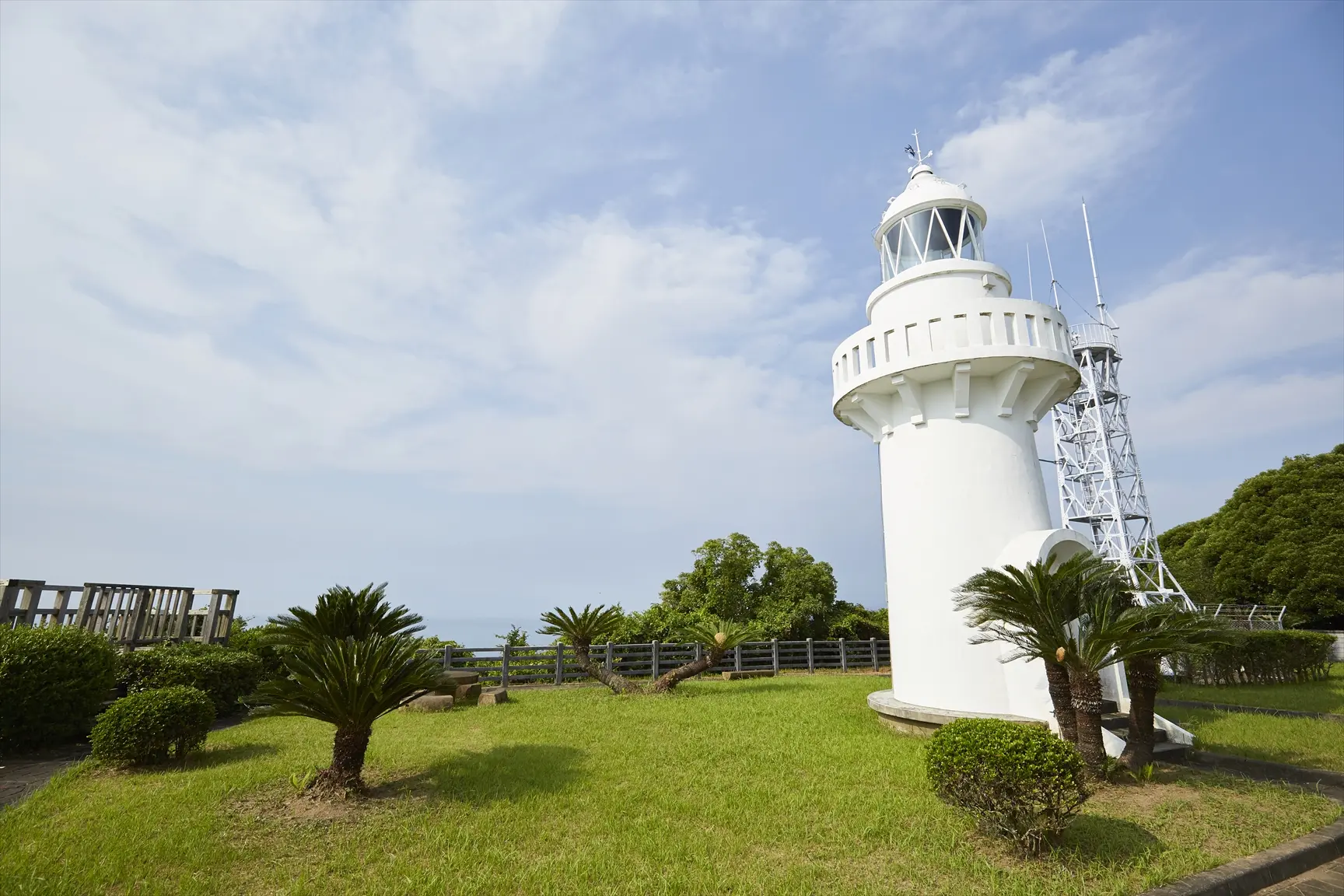 細島半島の先端に位置する⻄洋式灯台。大阪商船の寄港地である細島港の岩礁対策で設置された。初代は白色六角形で、石材・煉瓦・木材・鉄板を組み合わせた設計だったが、建てられてから12日後に火災で焼失してしまった悲運の物語を持つ。昭和の大戦期に改築され、半円アーチ形に突出する出入口や、バルコニーの大きな三角形の持送りなど、昭和期流行の意匠が取り入れられた。