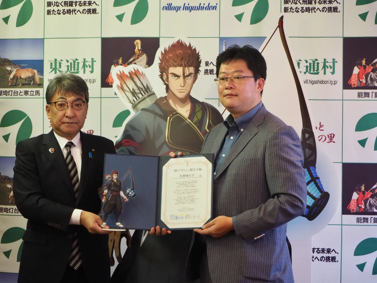 燈の守り人キャラクターを活用して、地域の灯台を歴史・文化資産として活用する機運をつくるため、「尻屋埼灯台」が立地している青森県下北郡東通村の畑中稔朗村長を「燈の守り人」製作委員会プロデューサーの柴田英知が2021年12月10日(金)に表敬訪問し、キャラクターの贈呈式を実施しました。